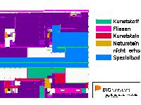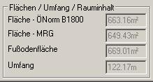 The floor area, the room area according to ÖNORM B 1800, and the area according to the Tenancy Law are determined. To make this possible, three different types of deduction areas are managed. The deduction areas are automatically assigned to the rooms, even if the corresponding layers are not visible.